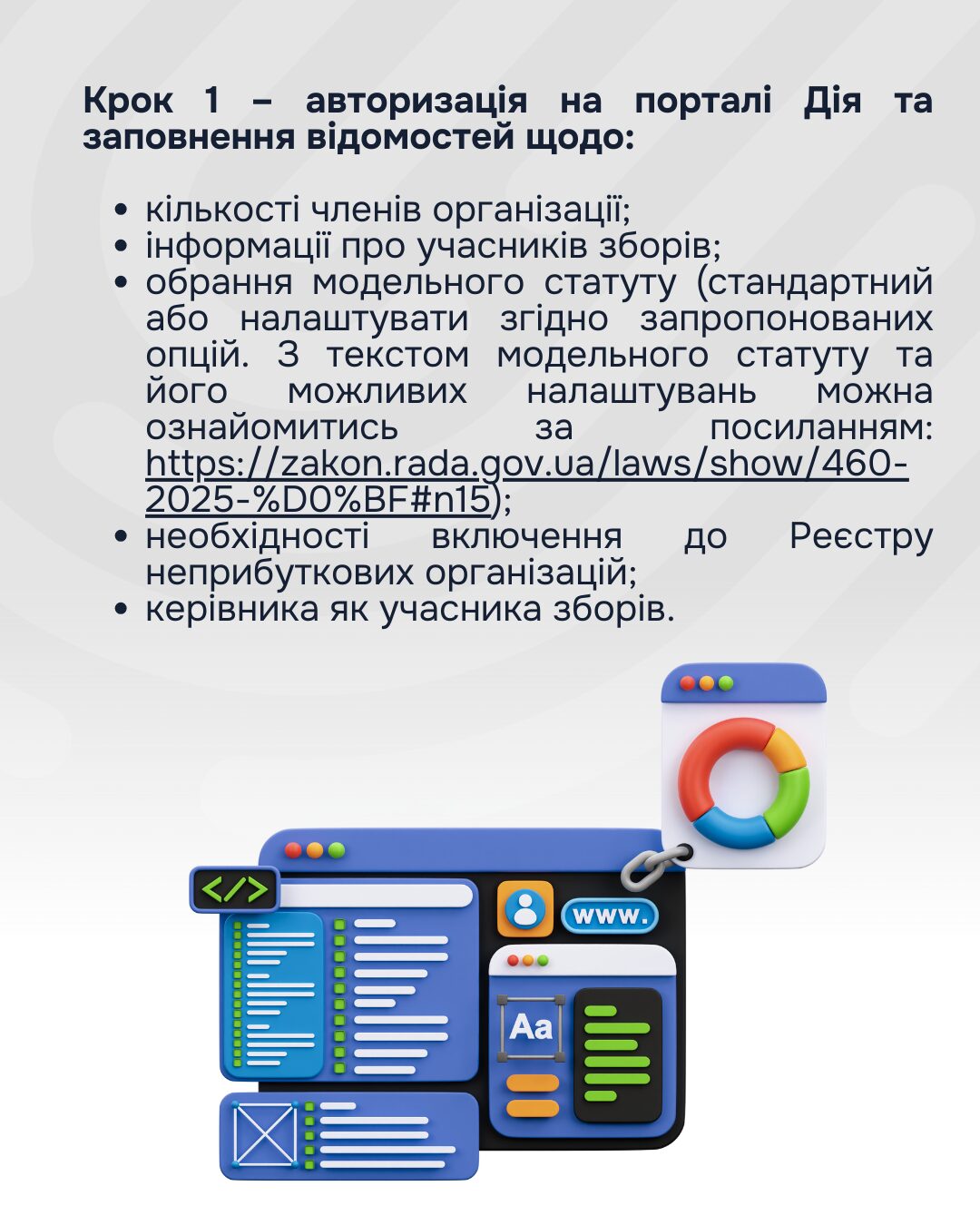 Нижче наведено покроковий алгоритм переходу громадської організації до діяльності за модельним статутом в онлайн-форматі.