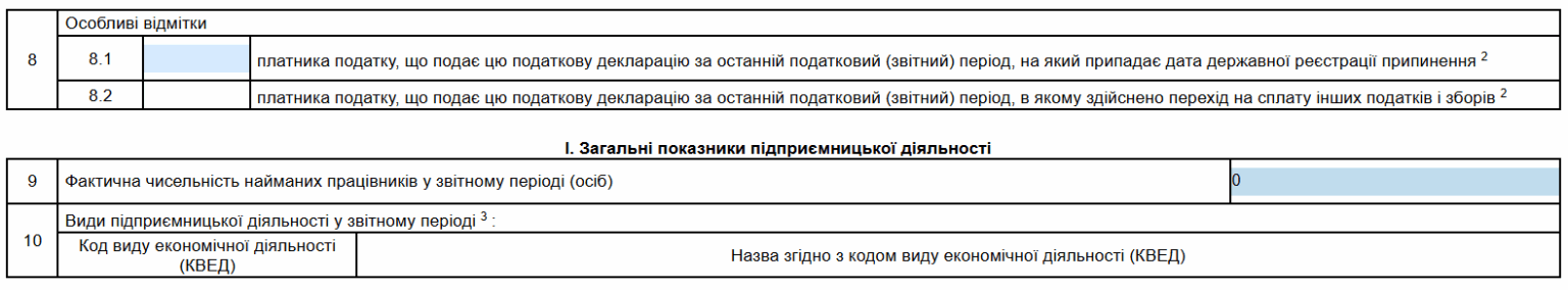 Рядок 8 заповнюють за потреби. У рядку 8.1 ставлять “х” тільки якщо ФОП зареєстрував припинення (знявся з держреєстрації) у ІV кварталі 2025 року і подає ліквідаційну ЄП-декларацію. А в рядку 8.2 – якщо ФОП з 01.01.2026 перейшов на загальну систему.