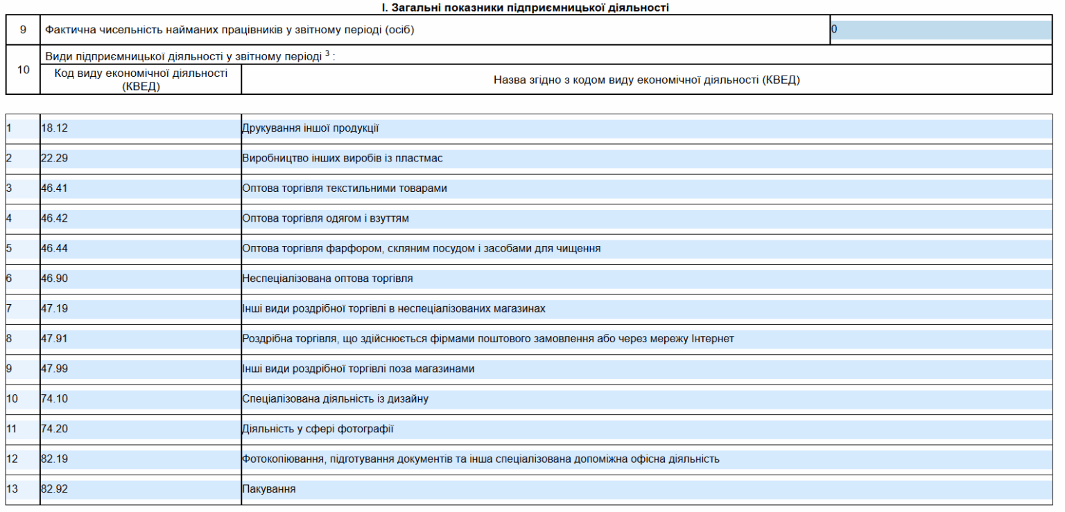 У електронній версії документам “шапка” декларації заповнюється автоматично. Зокрема, тип (“Звітна”, “Звітна нова”, “Уточнююча”), реєстраційні дані ФОП, кількість найманих працівників, коди КВЕД. На останніх двох зупинюсь детально.