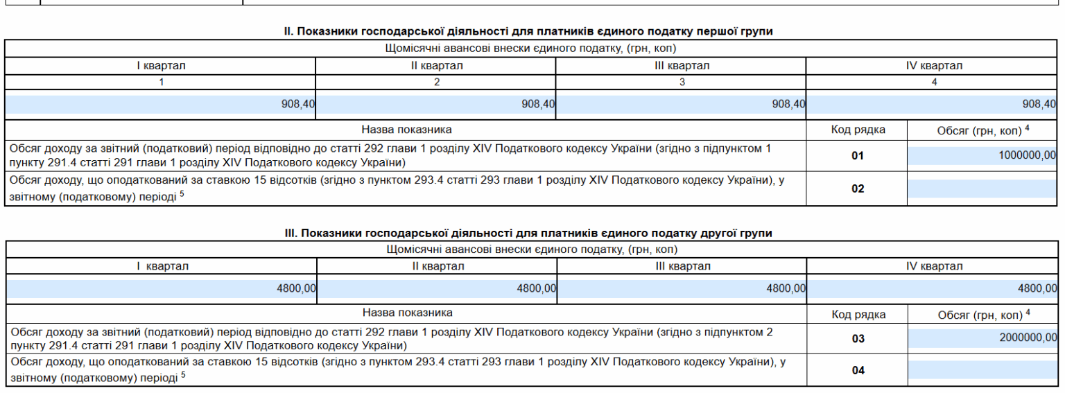 Рядки 02 і 04 заповнюють лише у разі перевищення ліміту доходу для перебування у своїй групі. Як заповнити декларацію в такому випадку? Читайте і дивіться у статті Декларація з єдиного податку, якщо перевищено ліміт доходу.