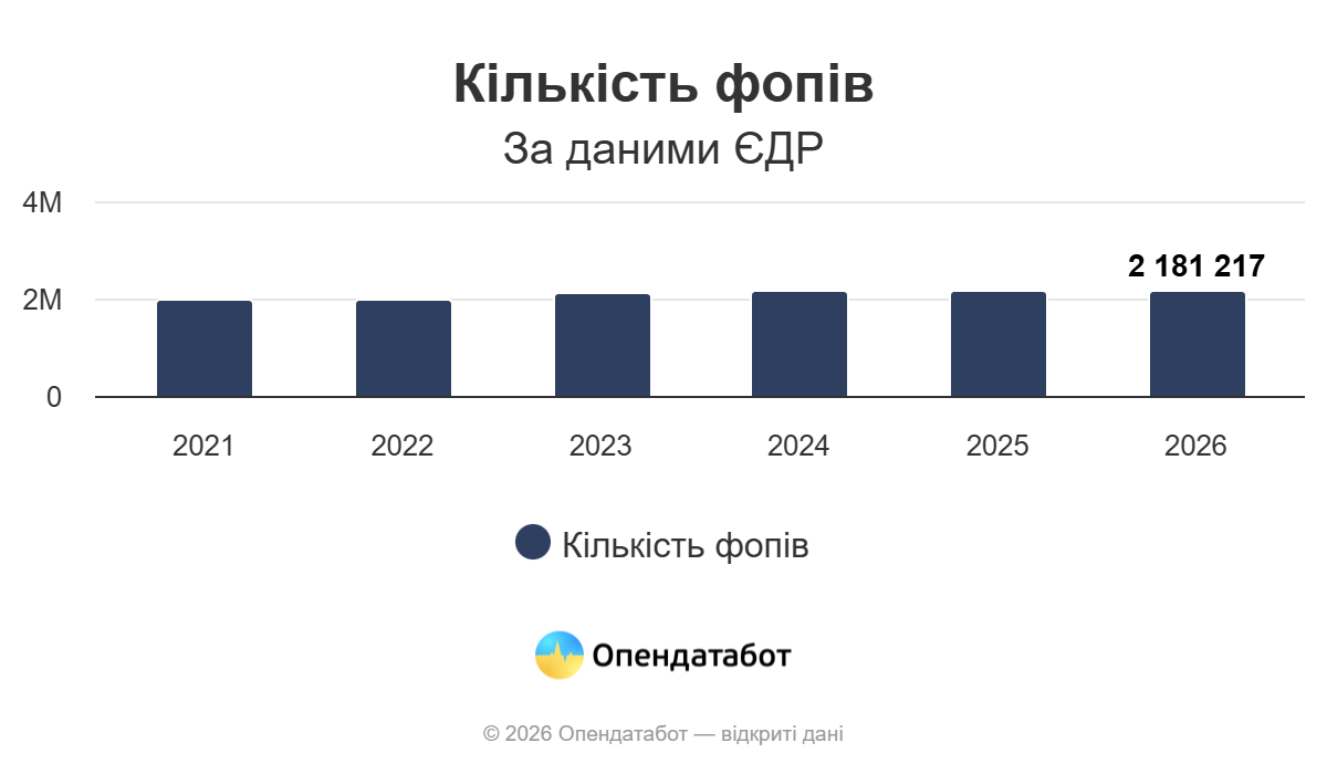 Так, 2,1 млн ФОПів наразі нараховується в Україні у 2026 році. Це на 6 тисяч більше, ніж у кінці 2025 року. Загалом за 4 роки повномасштабної ФОПів побільшало на 194 тисячі.