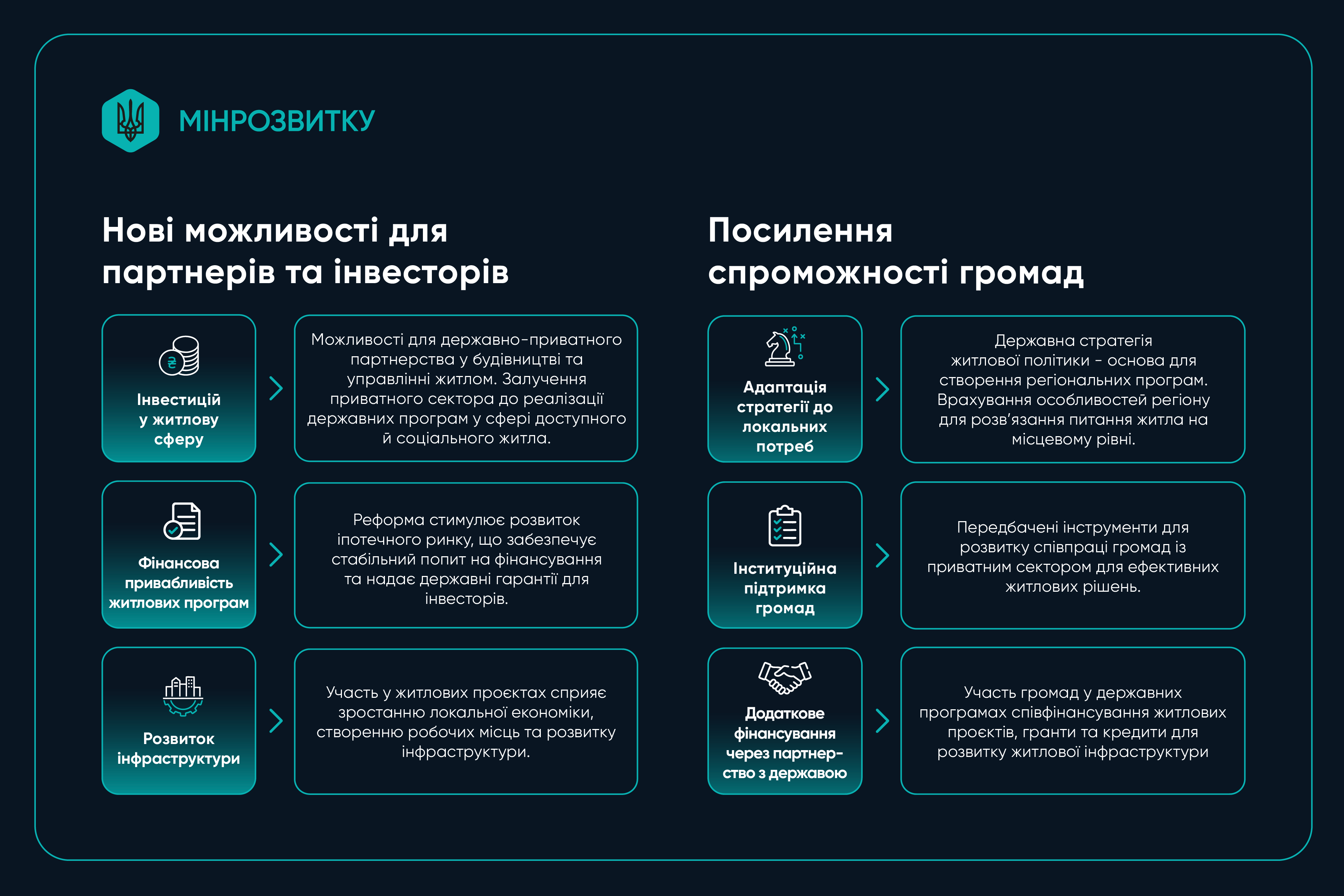 - Покращення житлових умов для мільйонів громадян, включаючи ВПО;