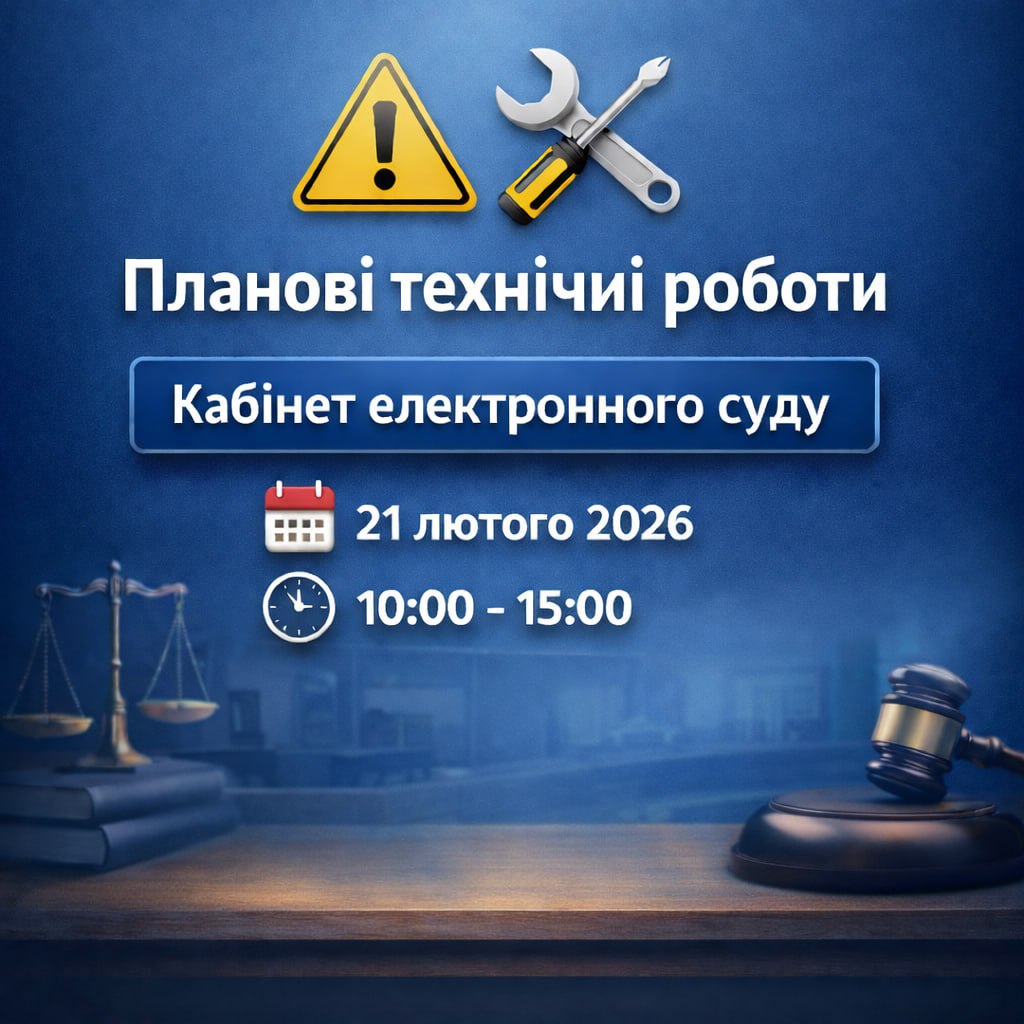 Електронне судочинство повідомляє, що у зв’язку з проведенням оптимізаційних робіт буде тимчасово обмежено роботу Кабінету електронного суду. 21.02.2026 (субота) з 10:00 до 15:00.