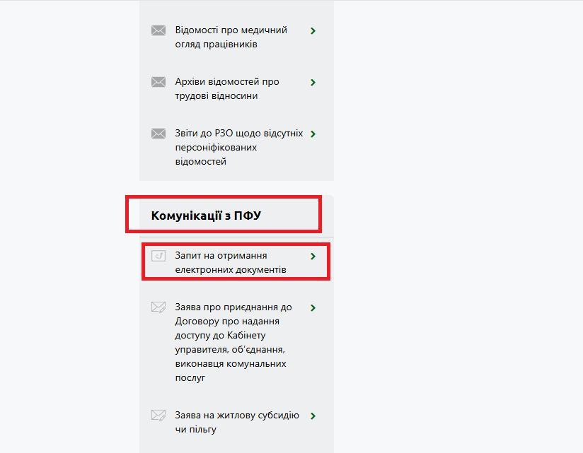 2. На панелі ліворуч у розділі “Комунікації з ПФУ” оберіть вкладку“Запит на отримання електронних документів”.