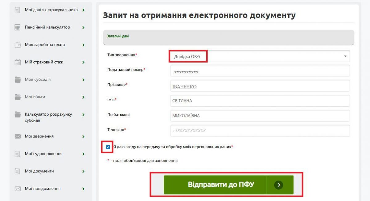 3. Заповніть форму, що з’явиться на екрані: з випадаючого переліку оберіть тип довідки (ОК-5), заповніть усі поля, позначені зірочкою “*”, якщо вони не заповнені автоматично, надайте згоду на передачу та обробку персональних даних. Натисніть кнопку “Відправити до ПФУ”.