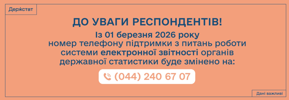 Держстат повідомляє, що з 1 березня 2026 року номер телефону підтримки з питань роботи системи електронної звітності органів державної статистики буде змінено на (044) 240 67 07.