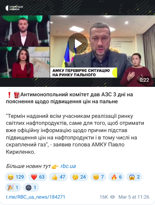 "Ці вимоги дуже зі стислими термінами. Термін наданий три дні всім учасникам реалізації ринку світлих нафтопродуктів, саме для того, щоб отримати вже офіційну інформацію щодо причин підстав підвищення цін на нафтопродукти, в тому числі скраплений газ", - зазначив Кириленко.