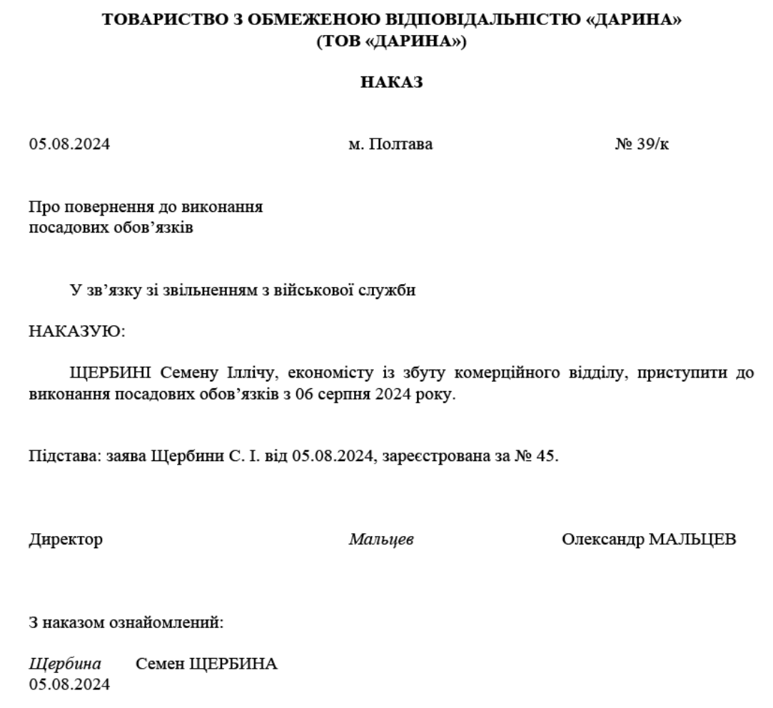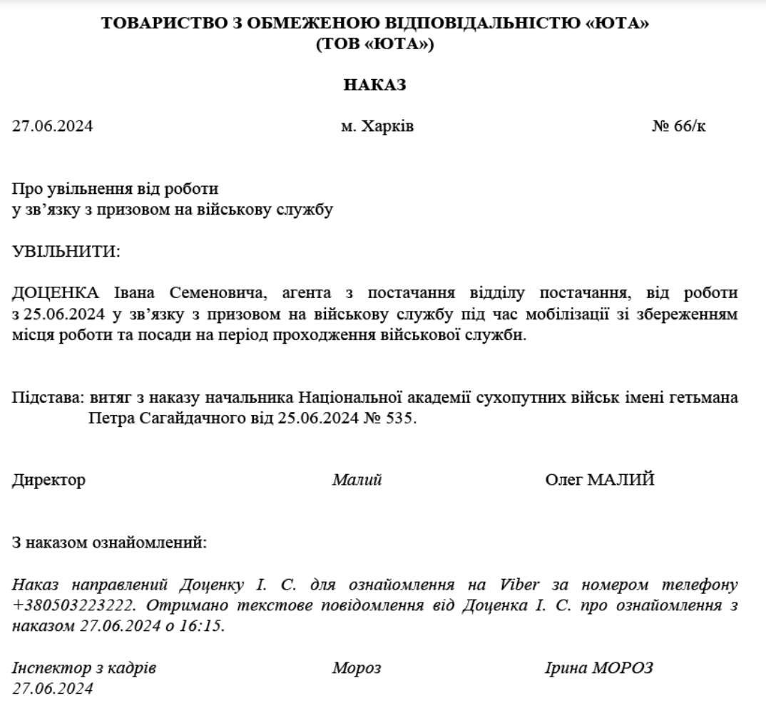 Наказ про увільнення від роботи у зв’язку з мобілізацією